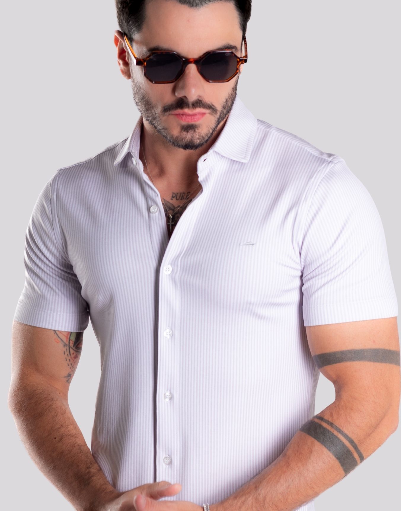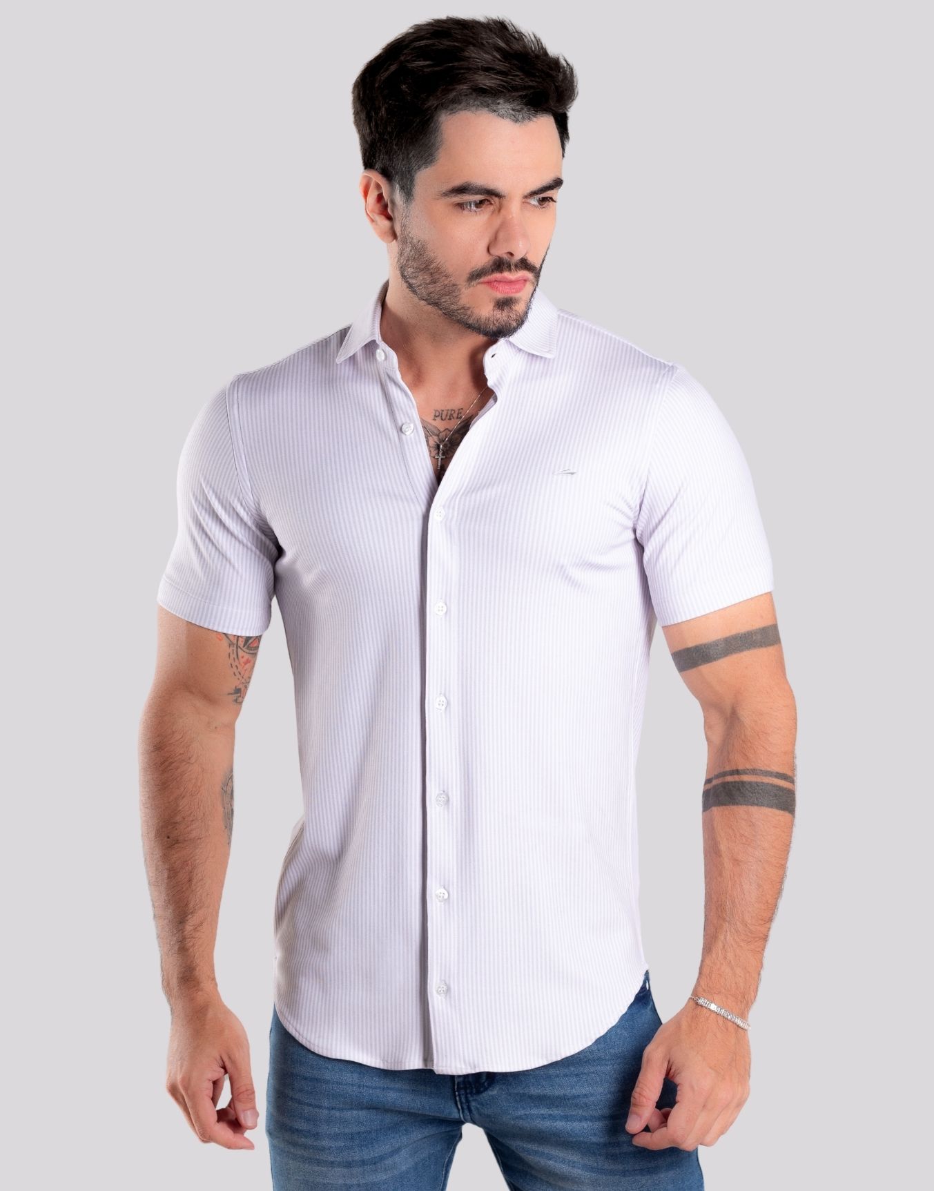 Camisa Masculina Slim Listrada com Tecnologia Anti-Odor – Bege foi desenvolvida para homens que valorizam elegância com praticidade no dia a dia. Com modelagem slim-fit e mangas curtas, ela se ajusta perfeitamente ao corpo, oferecendo um visual moderno e alinhado sem abrir mão do conforto.
