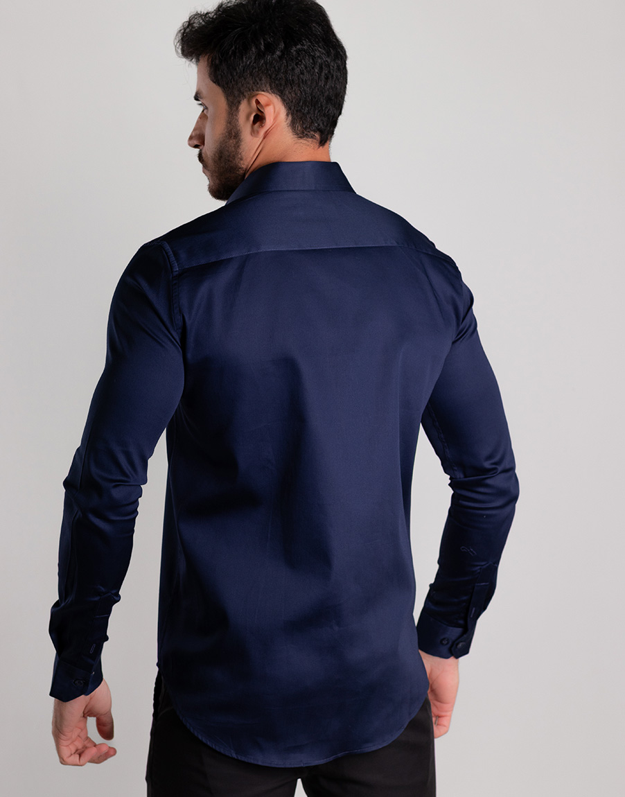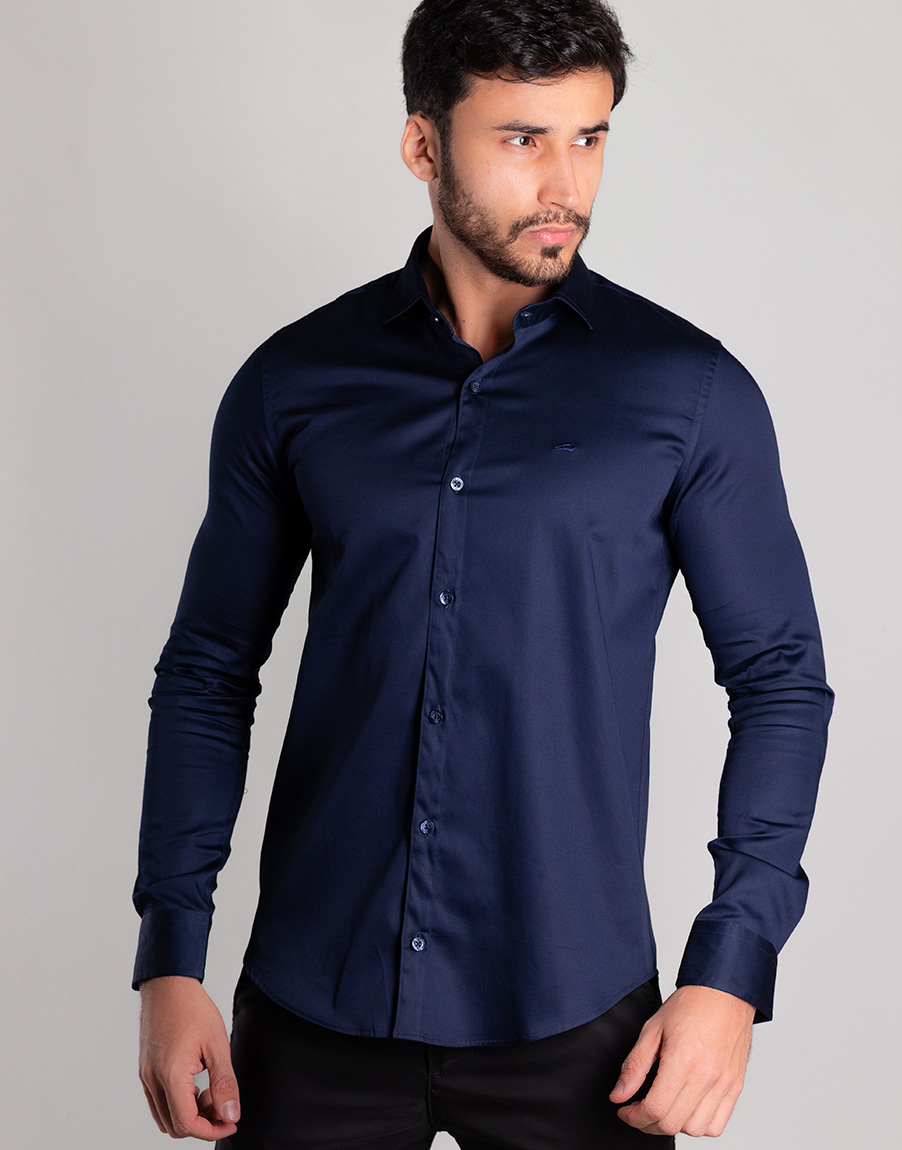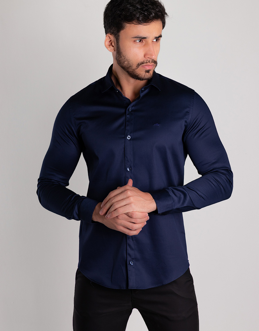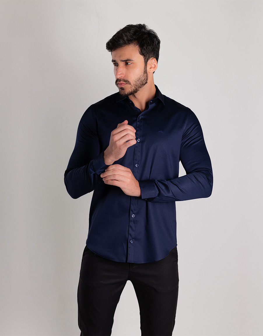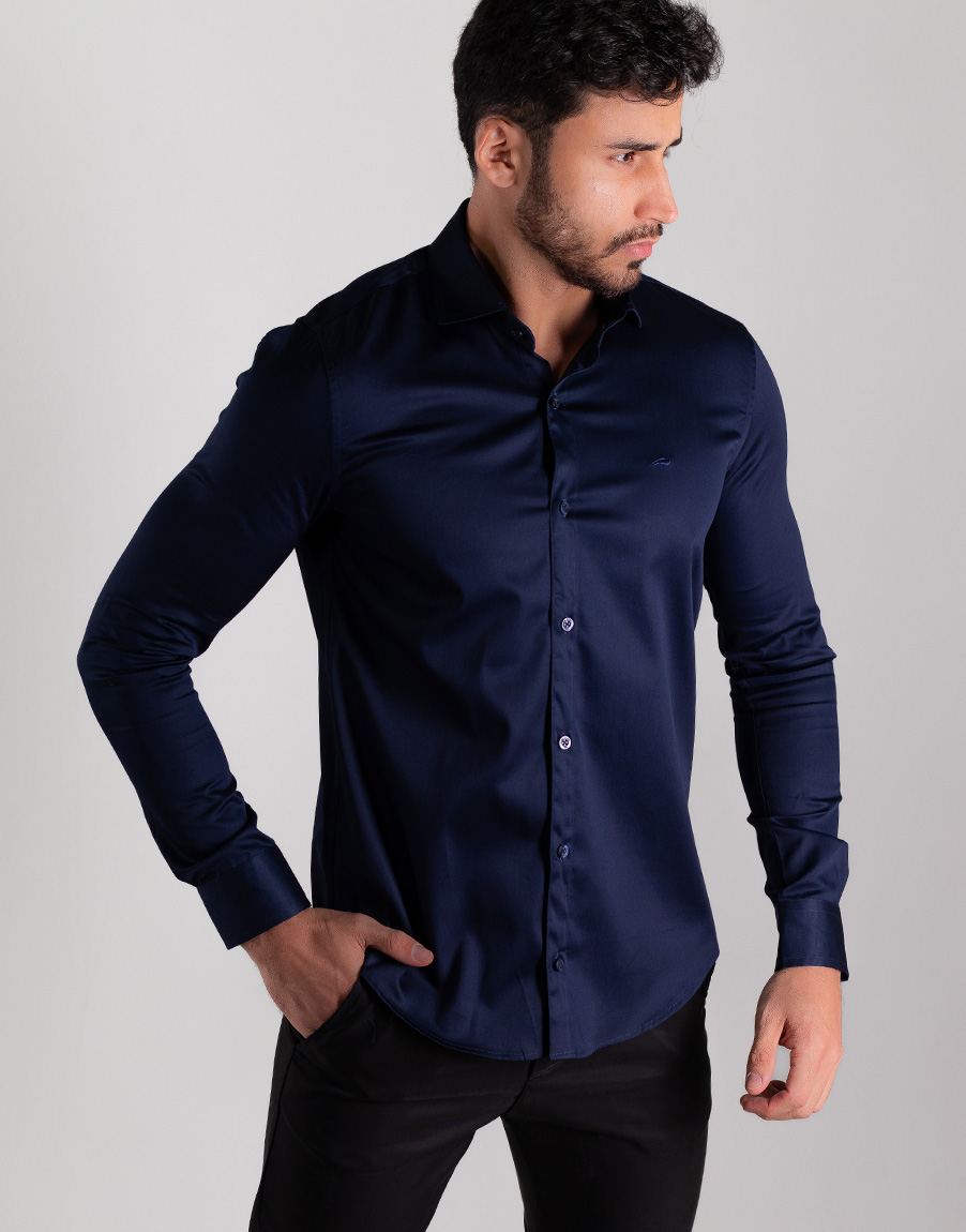 Camisa Slim Cetim Manga Longa – Cor Azul Marinho