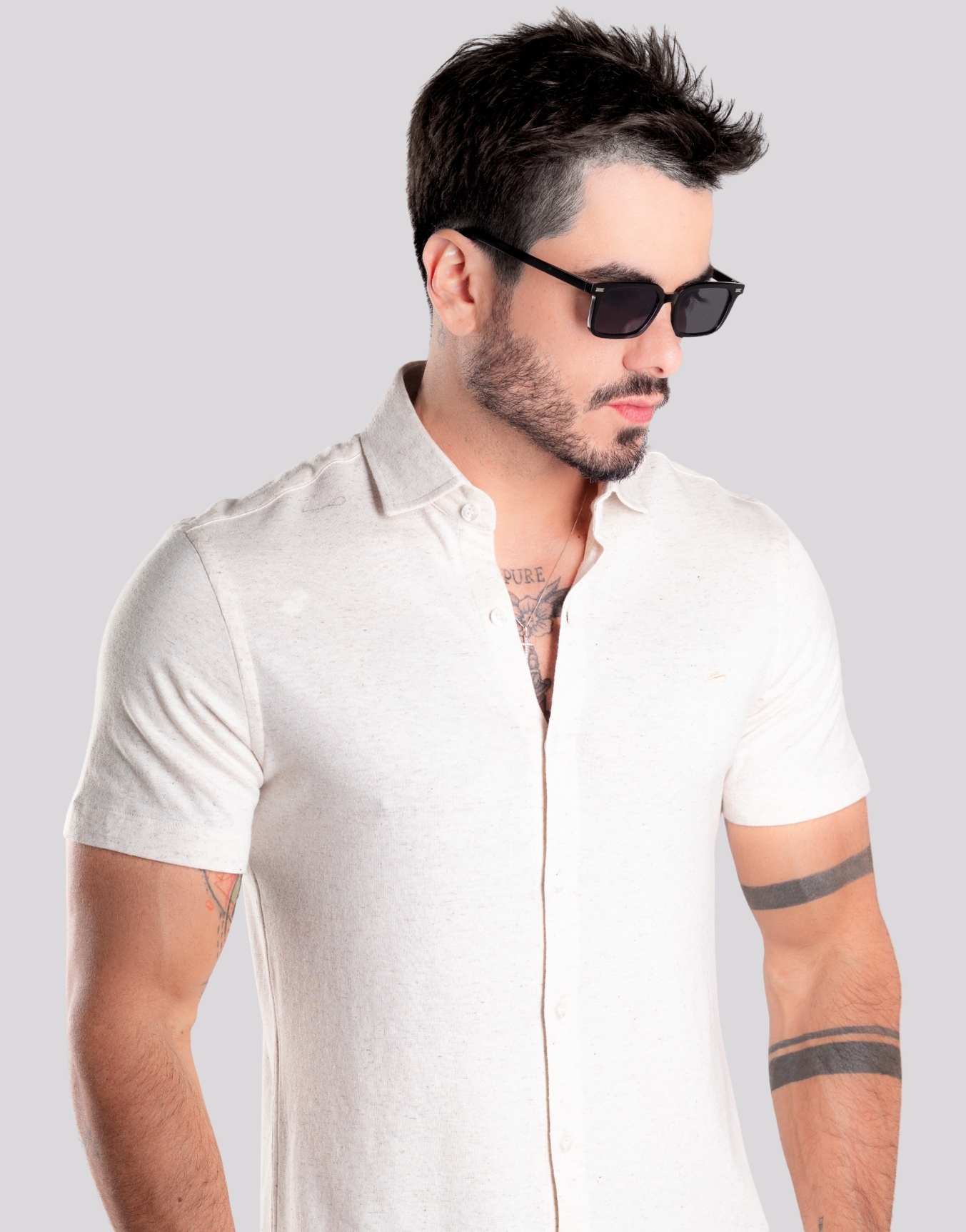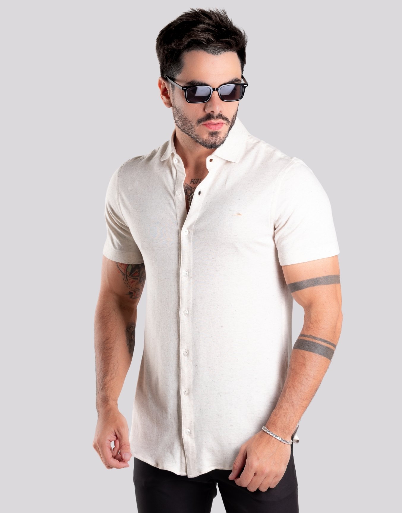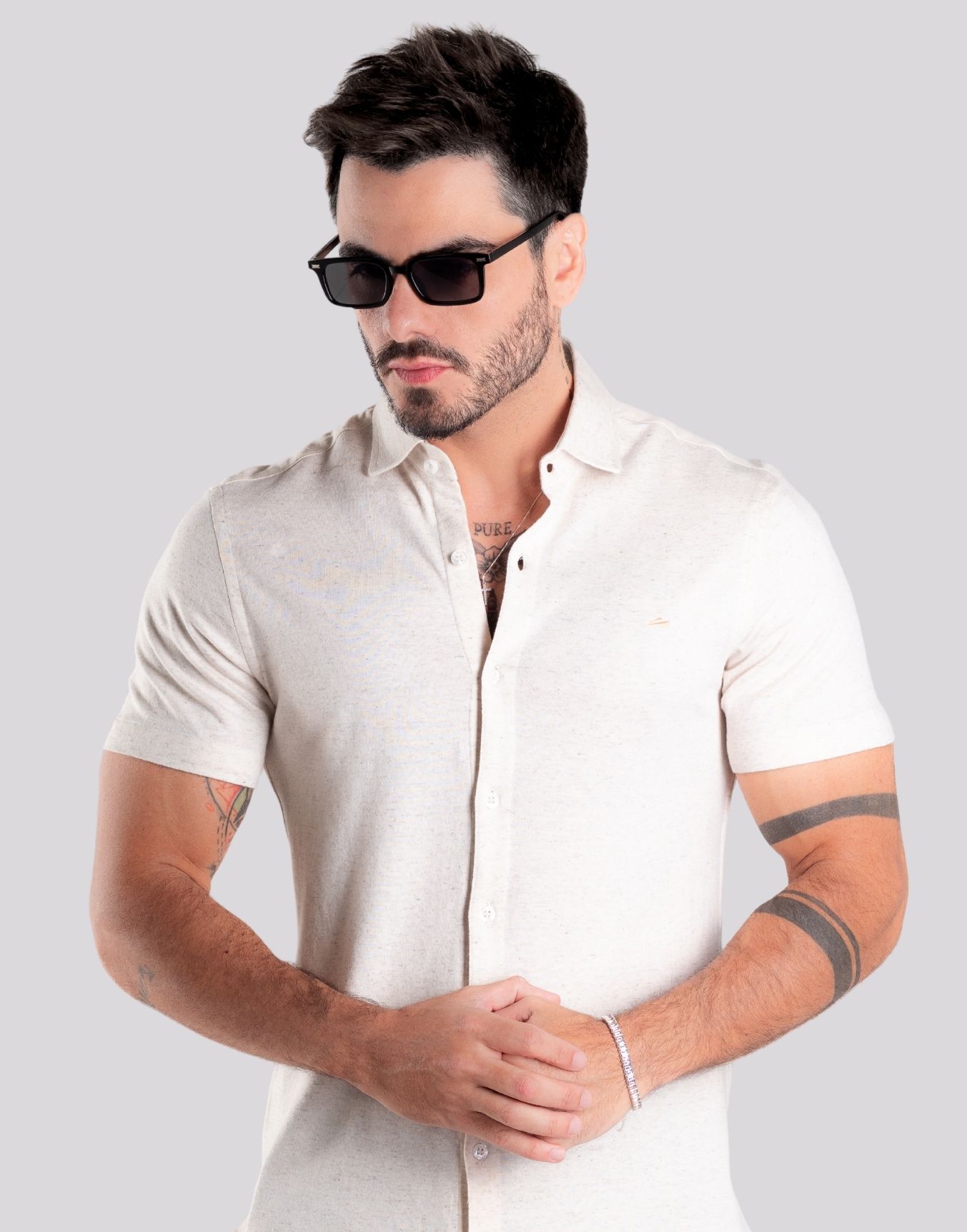 Para os dias quentes em que estilo e conforto precisam andar juntos, a Camisa Slim em Linho com Alta Durabilidade é a escolha certa. Confeccionada com uma malha nobre composta por 50% algodão, 38% viscose e 12% linho, essa camisa de manga curta oferece respirabilidade superior e toque leve, ideal para o clima tropical.