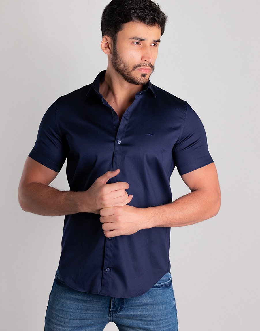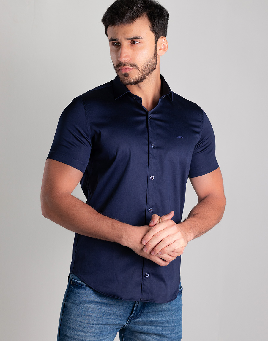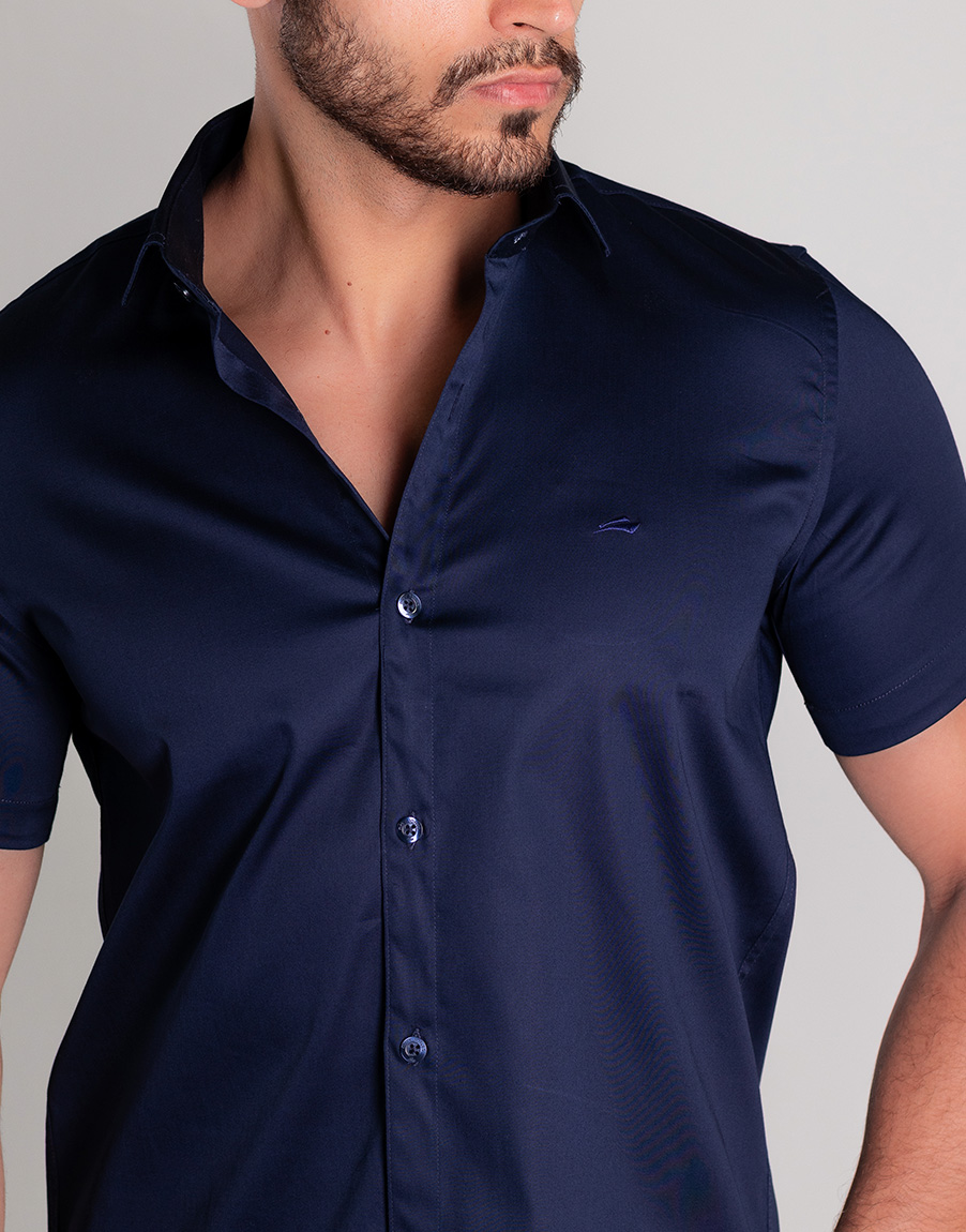 Camisa Social Masculina Manga Curta Cetim Premium Slim Fit – Cor Azul Marinho