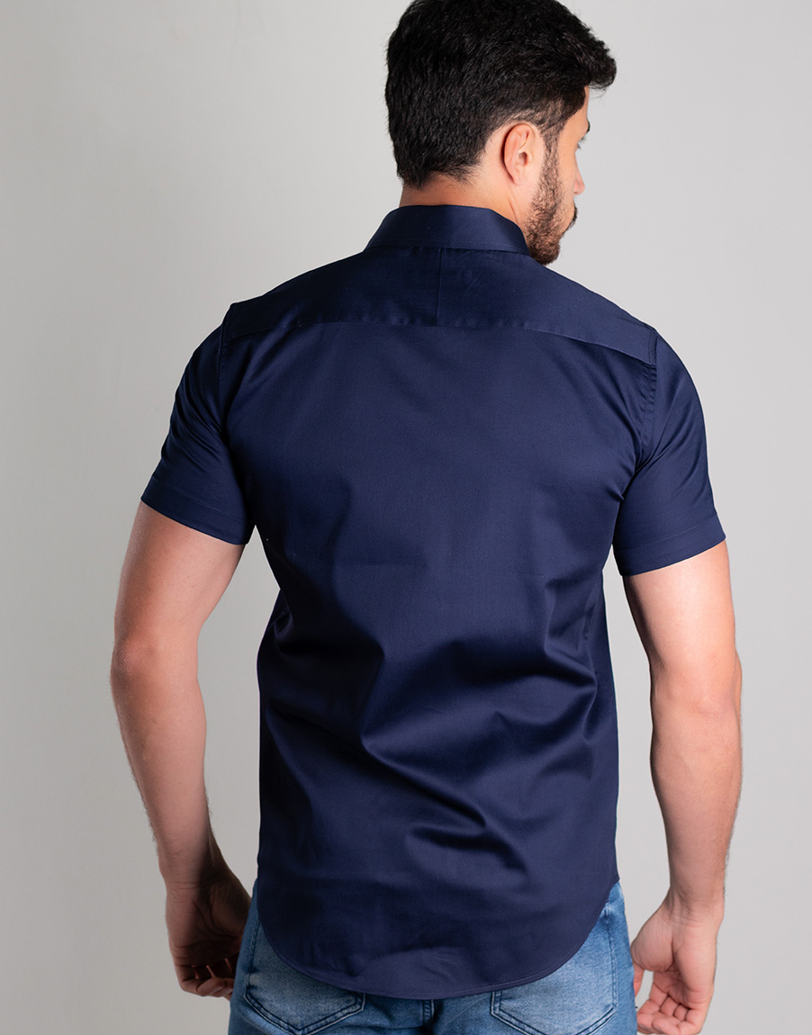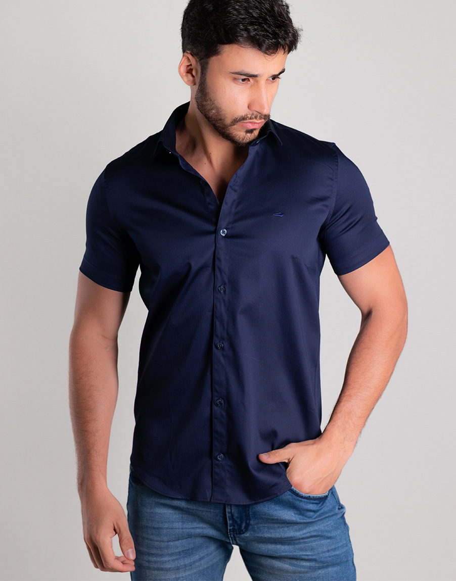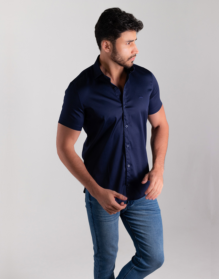 Camisa Social Masculina Manga Curta Cetim Premium Slim Fit – Cor Azul Marinho