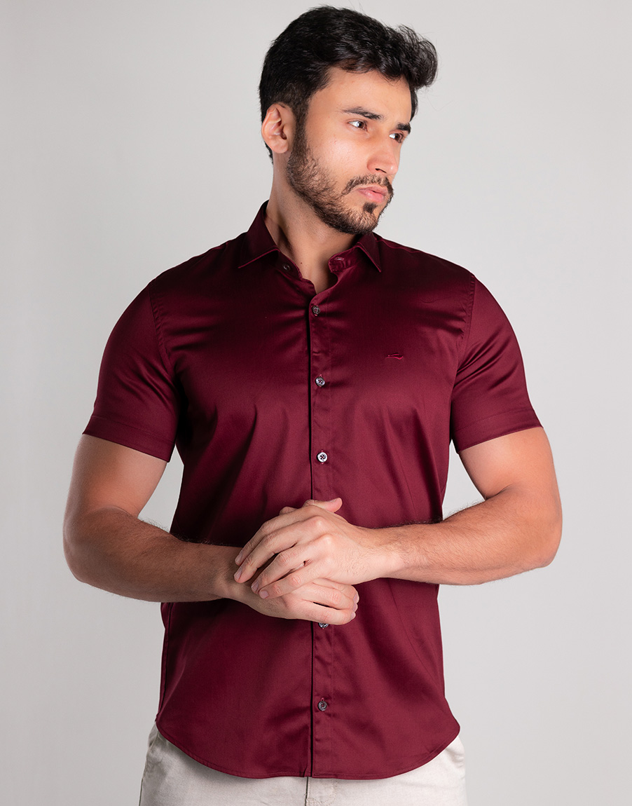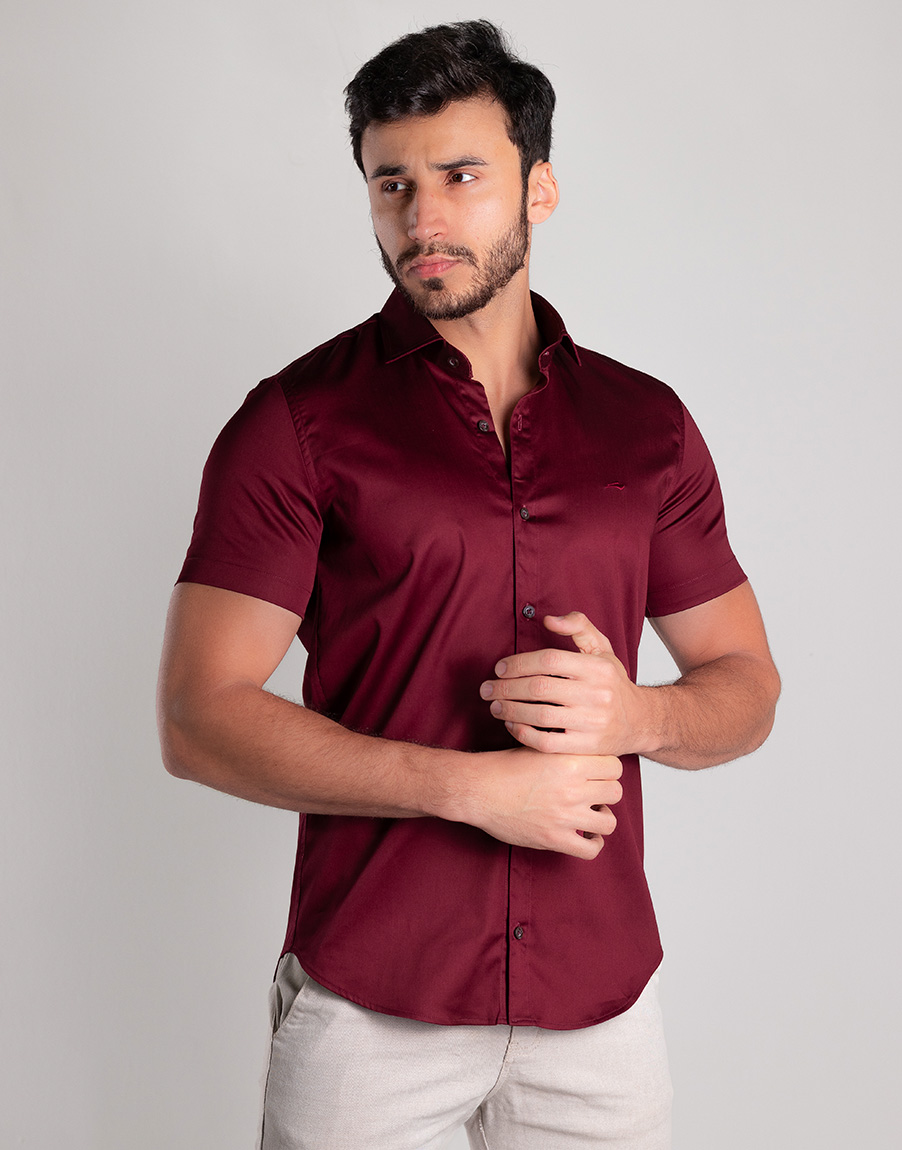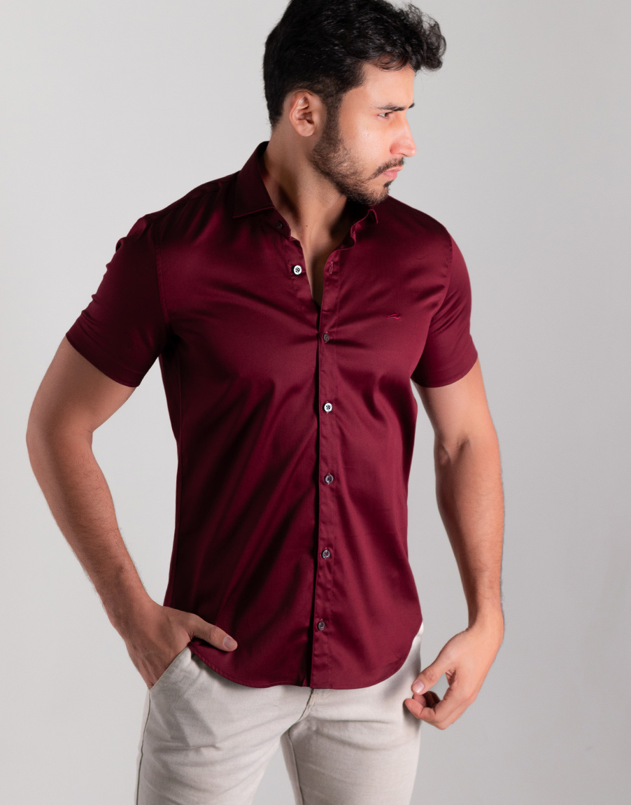 Camisa Social Masculina Manga Curta Cetim Premium Slim Fit – Cor Marsala