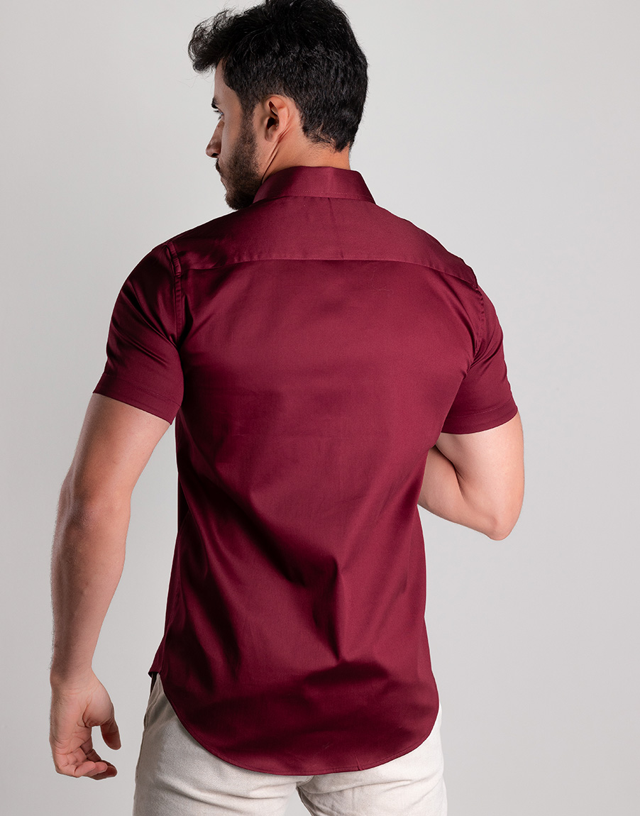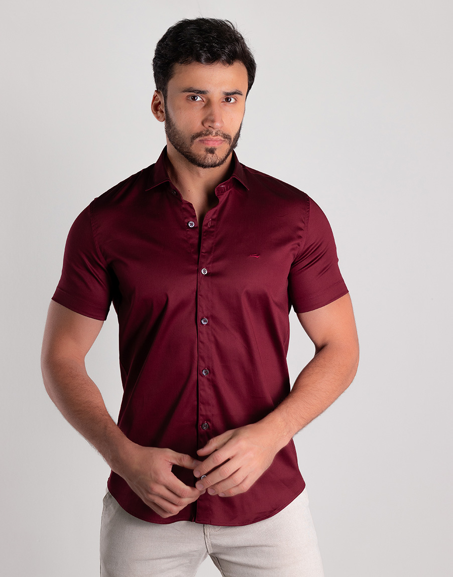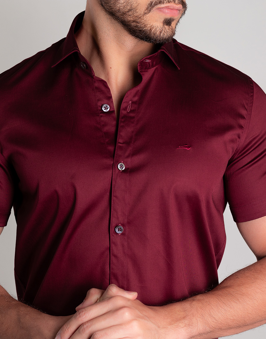 Camisa Social Masculina Manga Curta Cetim Premium Slim Fit – Cor Marsala