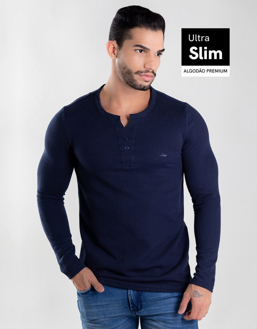 Henley Manga Longa com Textura Poá – Cor Azul Marinho