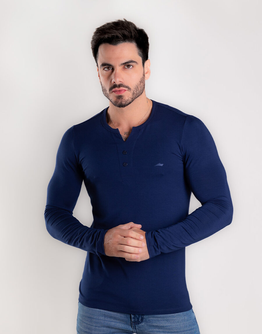 Camiseta Henley Masculina Malha Jeans – Cor Azul Marinho